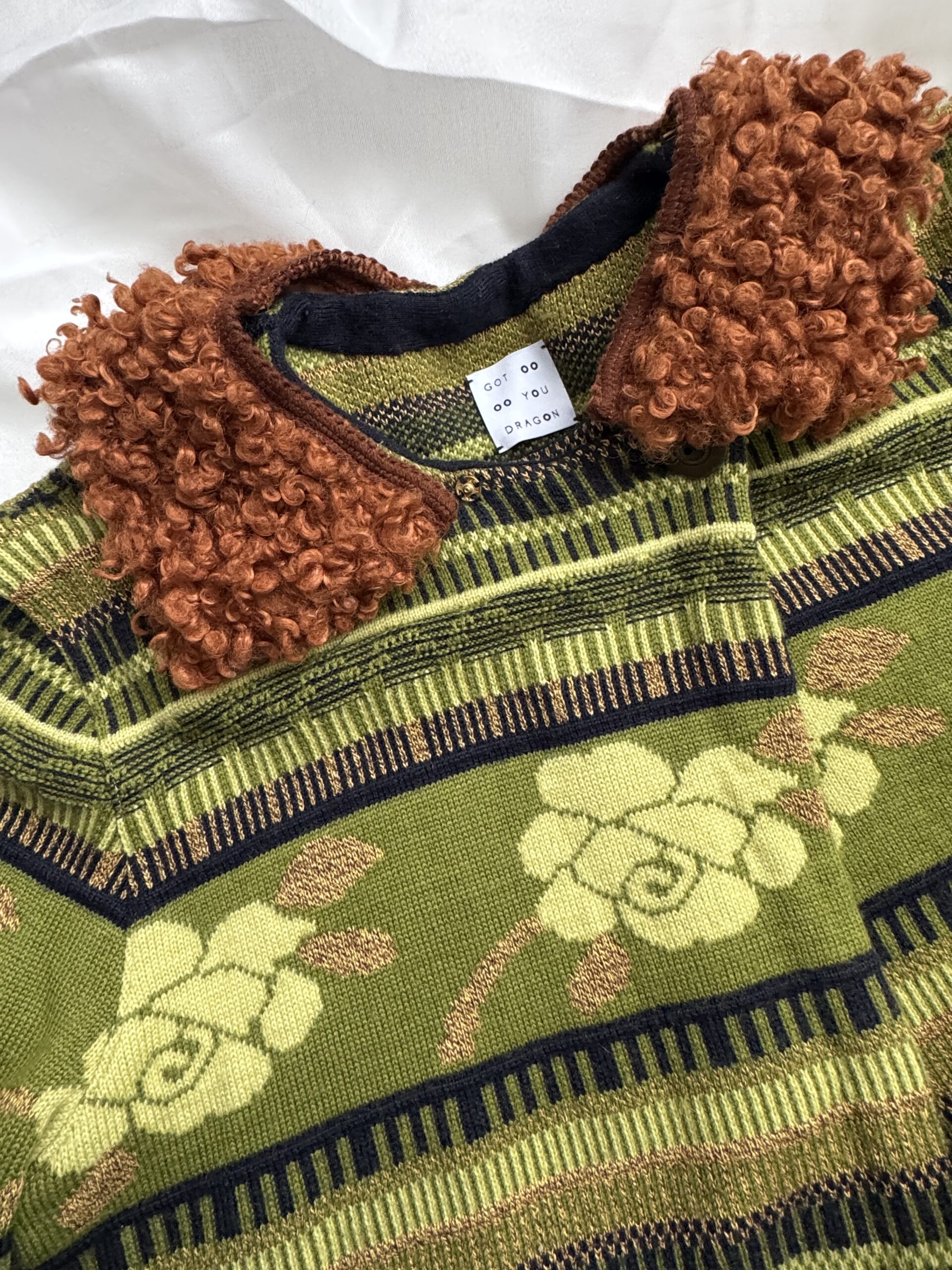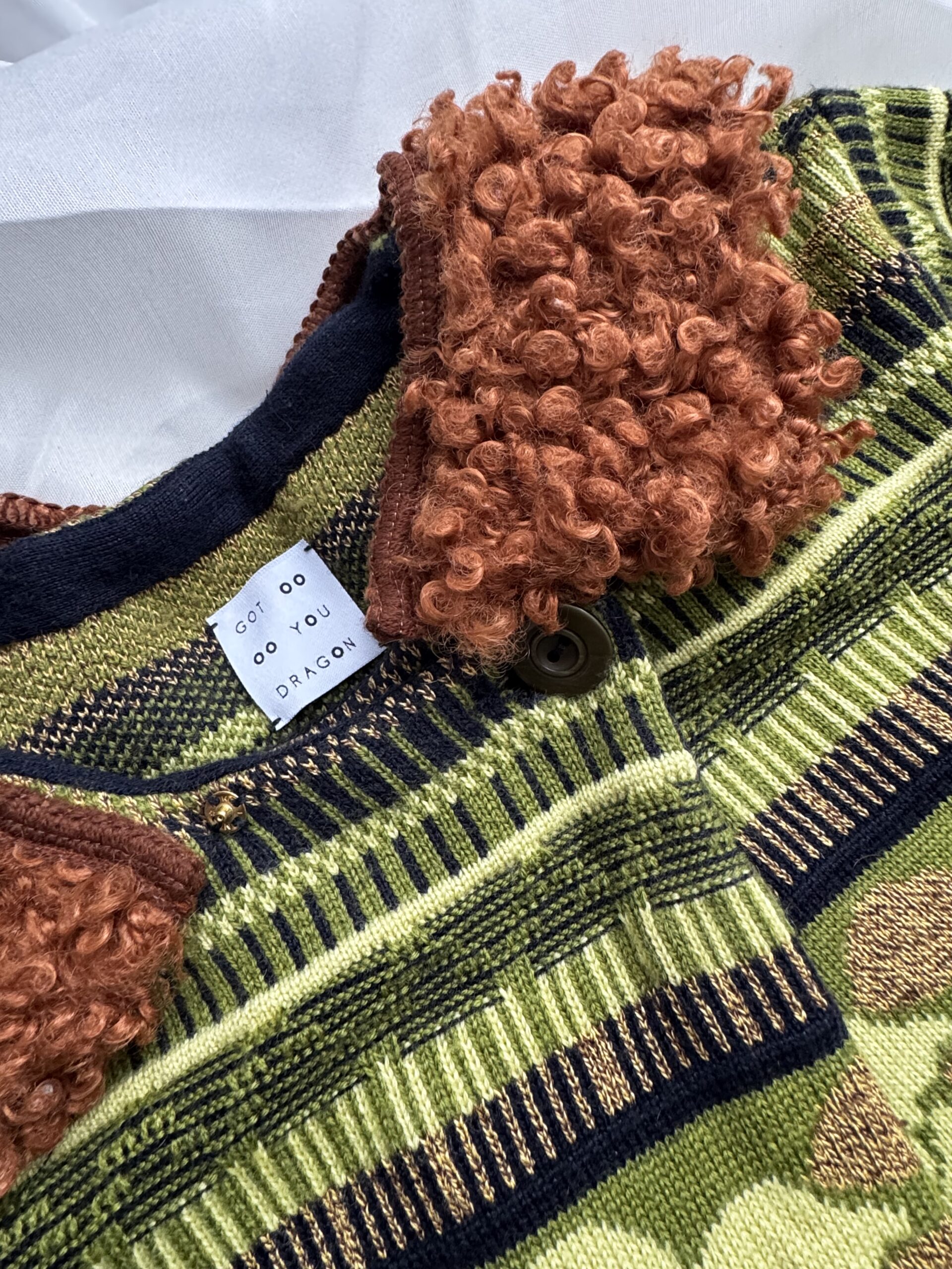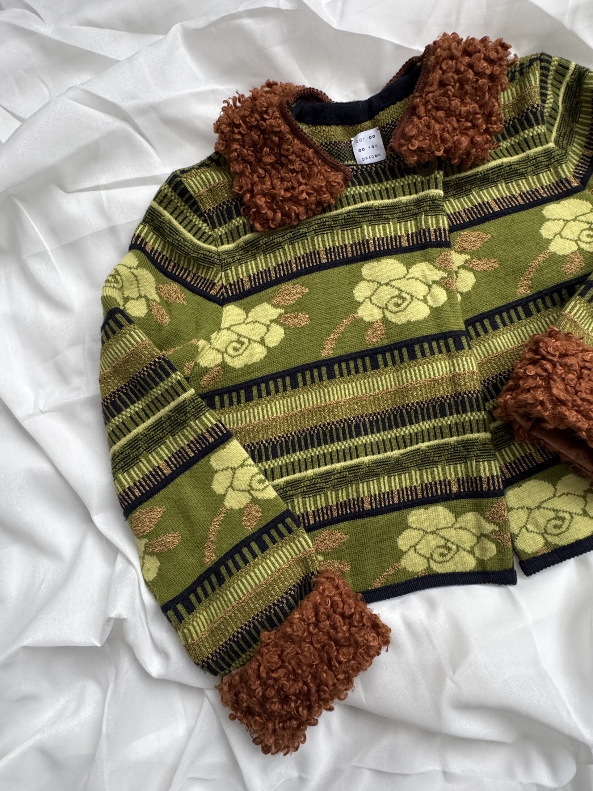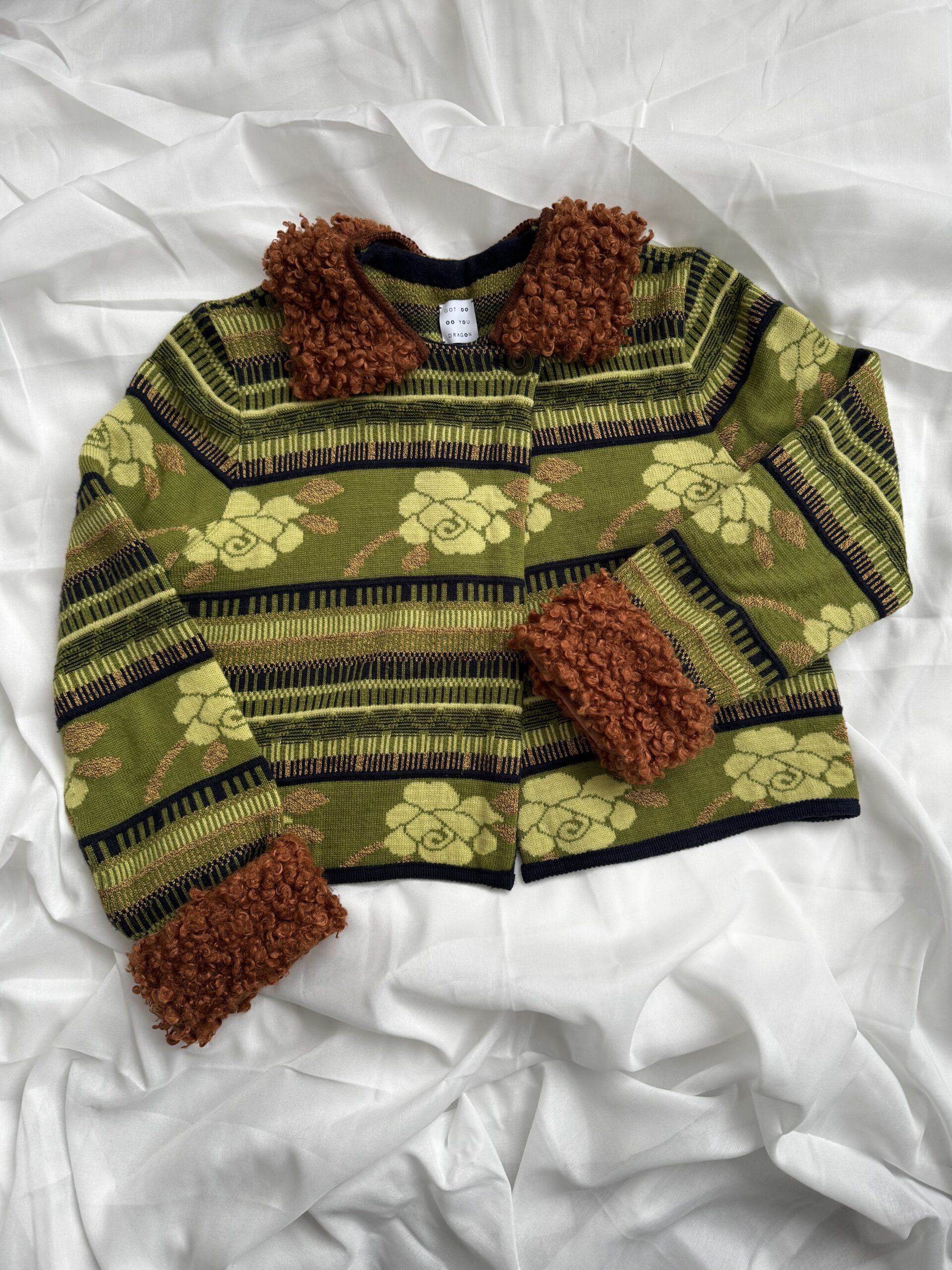 The original knit pattern is preserved, giving it a nostalgic character, while the silhouette feels modern and easy to style. Finished with removable soft faux fur cuffs and collar, repurposed from a pillowcase, adding texture and contrast to the piece.