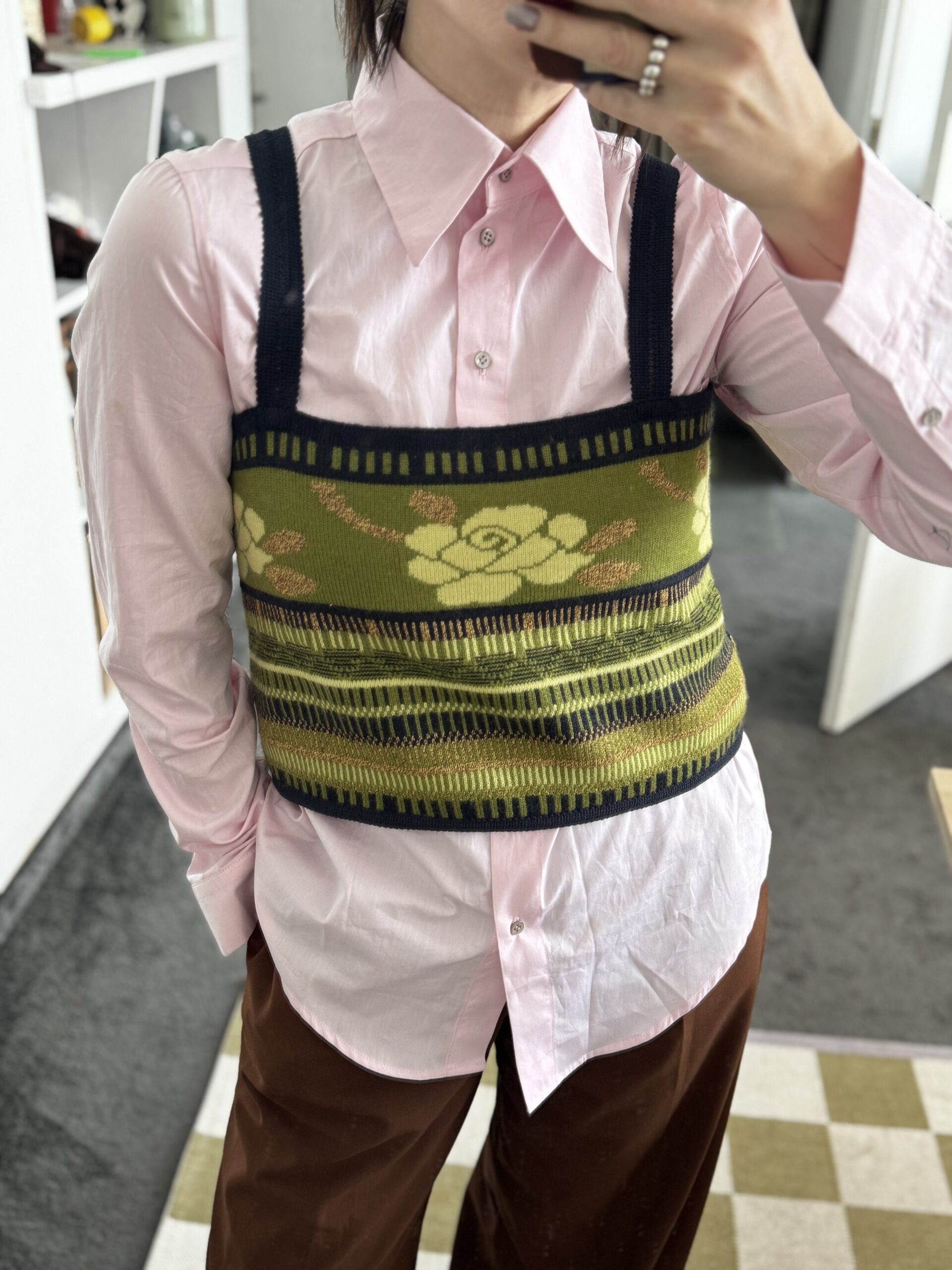 A one-of-a-kind knitted vest, reworked from a vintage wool-blend cardigan.