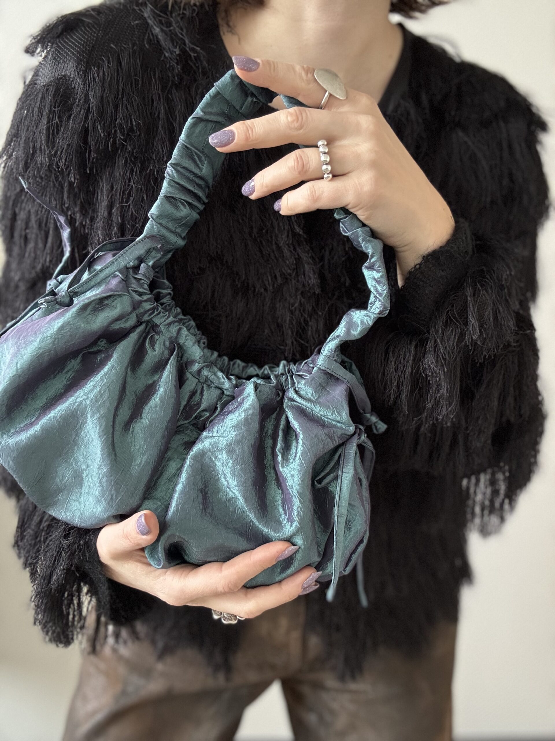 The gathered body and ruched handle create a relaxed yet intentional shape, while the drawstring closure lets you adjust the volume and silhouette as much as you like.