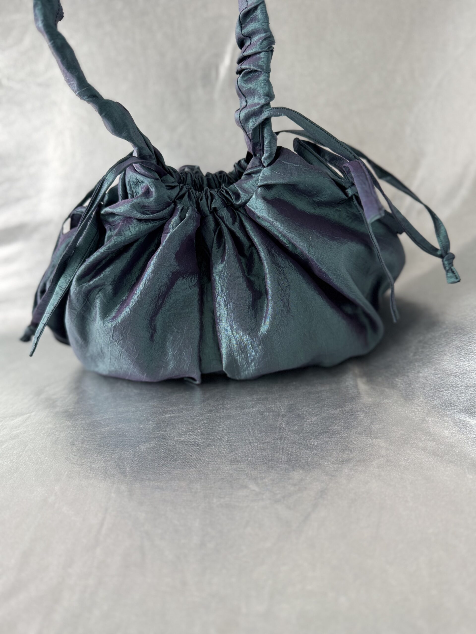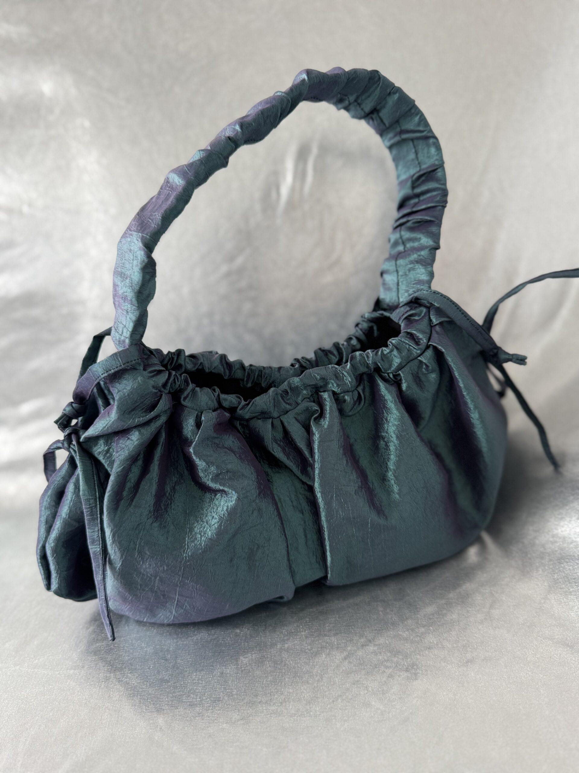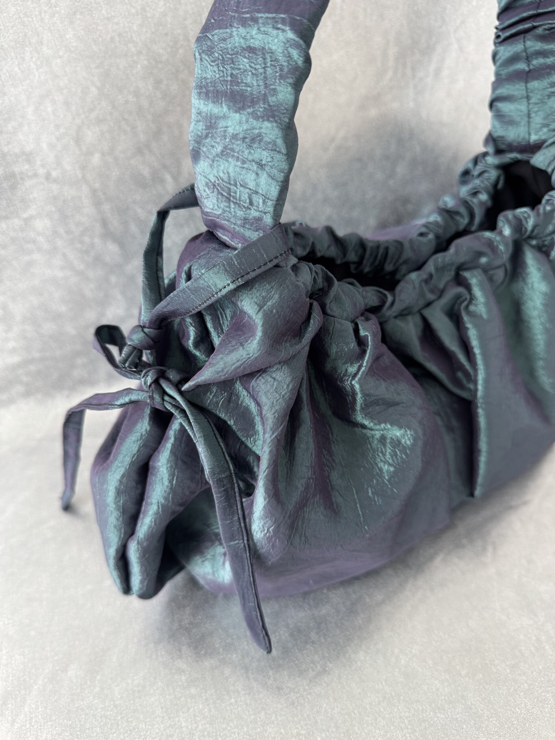 A soft, sculptural shoulder bag made from upcycled shiny curtain fabric.