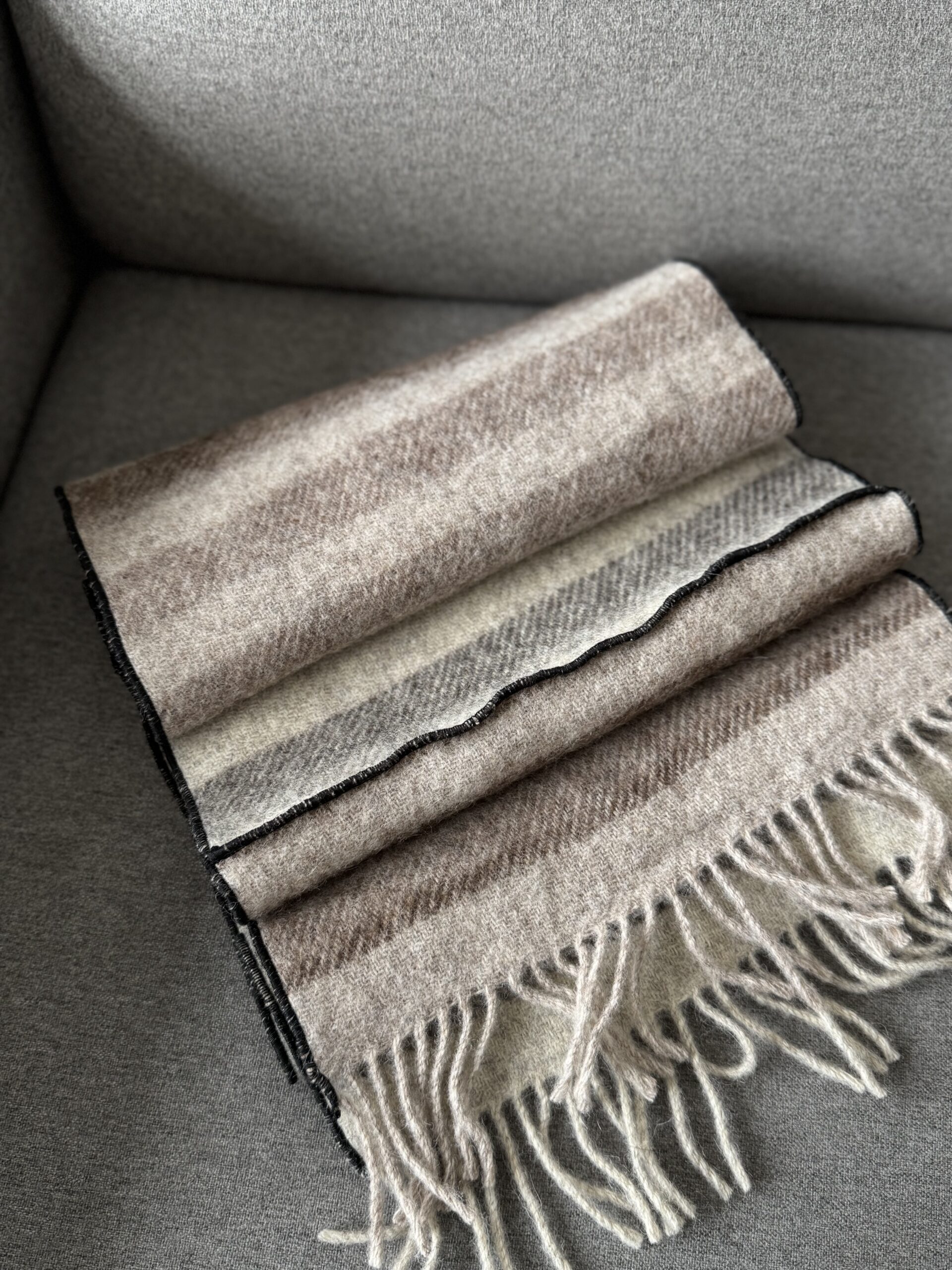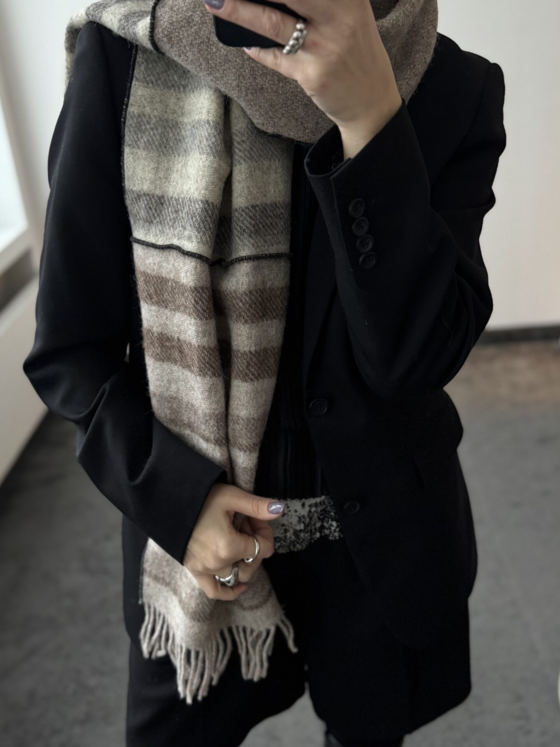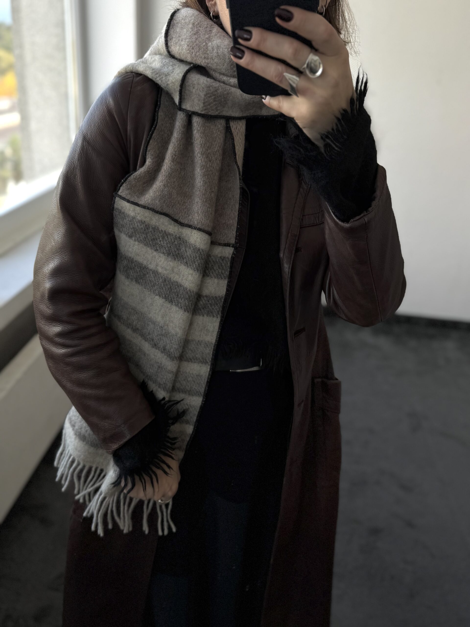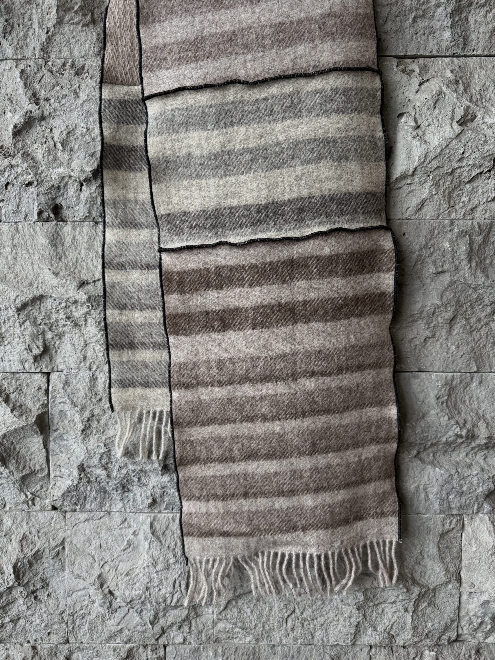 • A one-of-a-kind wool scarf made from upcycled wool swatches. Paired to create a harmonious patchwork look. Warm, soft, and sustainable — crafted from high-quality wool samples rescued from waste.