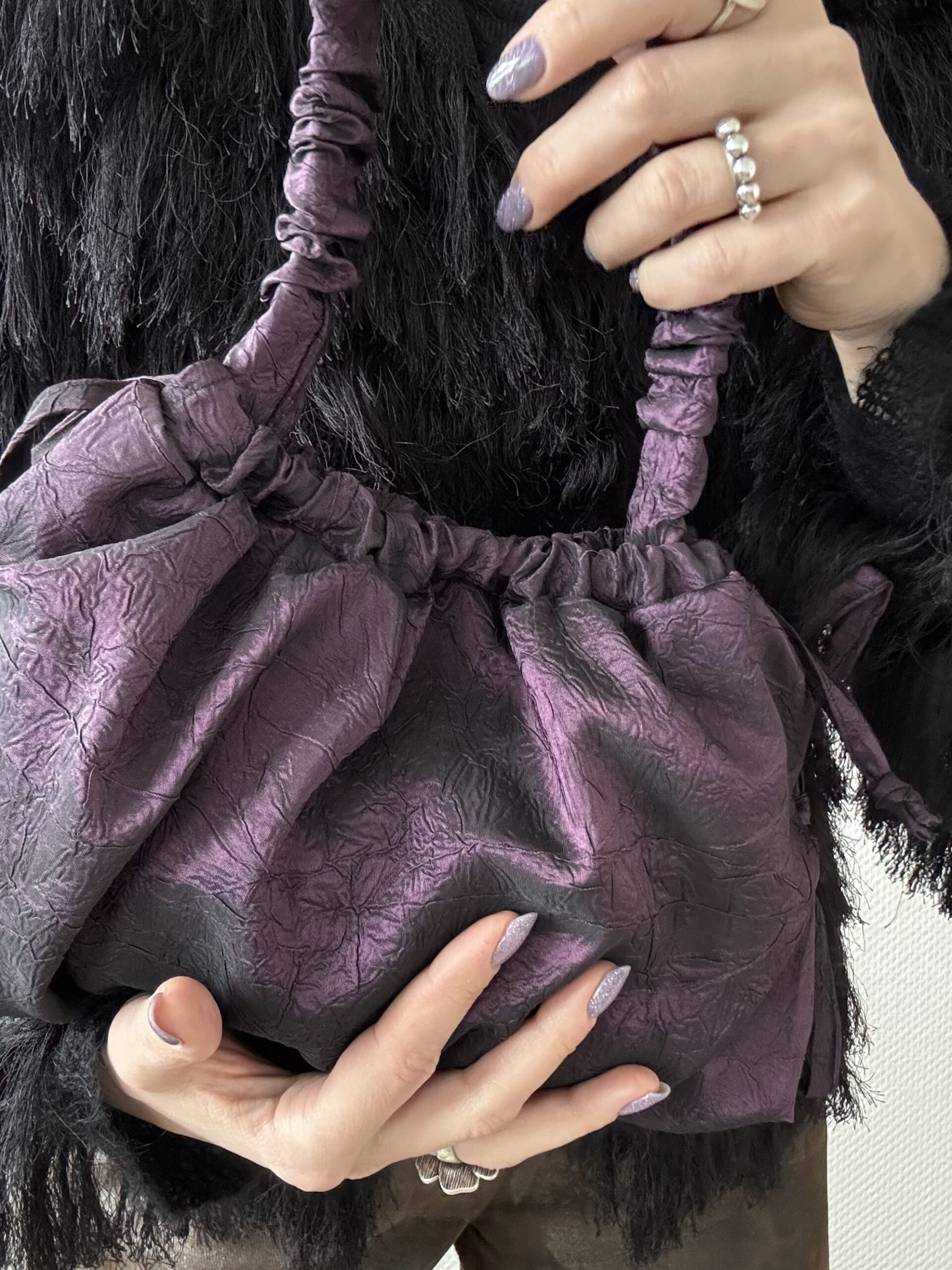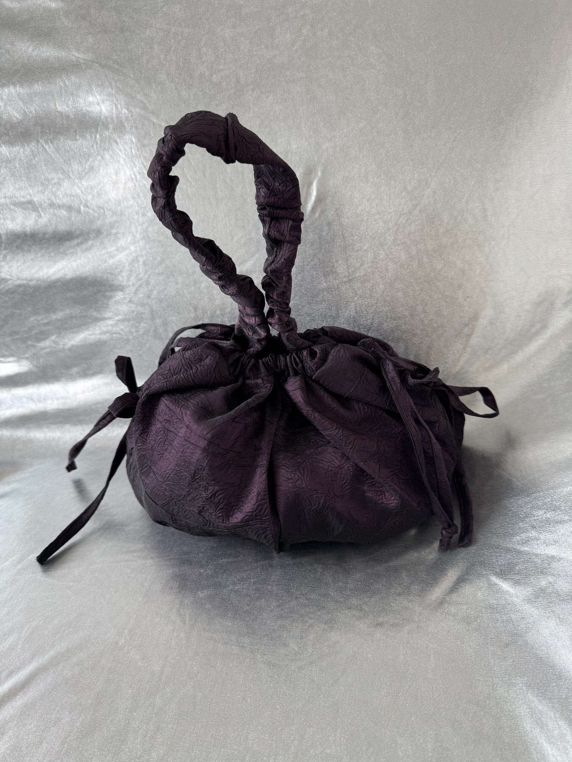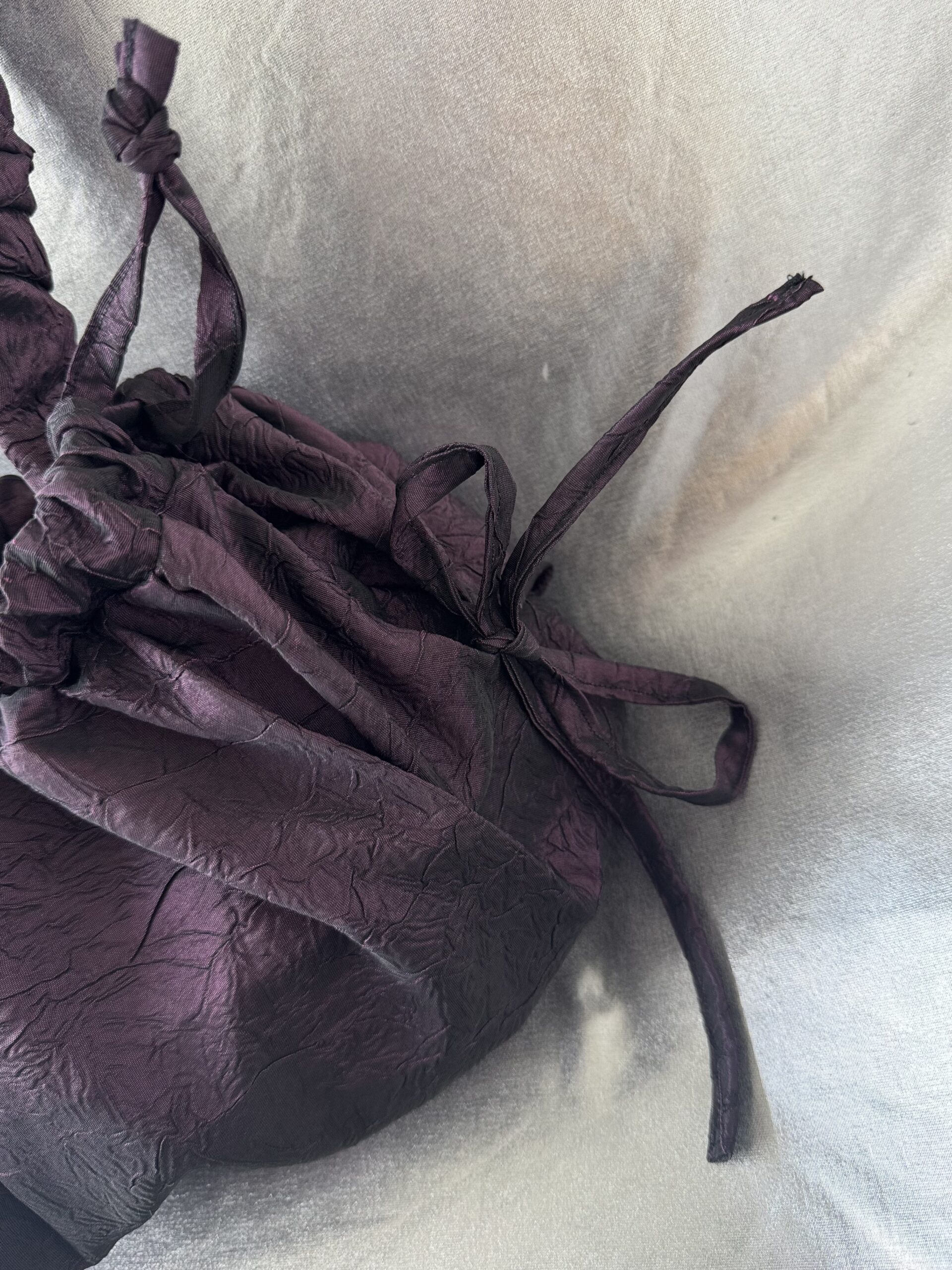 The Plum bag is crafted from repurposed curtain fabric that has a subtle crinkled surface. This fabric gives the bag depth and character.